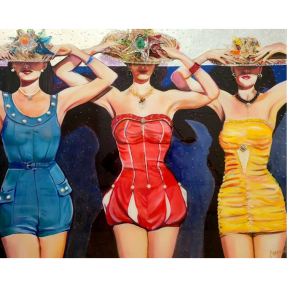 "Boardwalk Beauties" takes us back to a time where less was more. This piece embodies the exquisite style of one-piece bathing suits in an era where minute details defined elegance. We originally named the original "Beaux Maillots" (beautiful one-piece bathing suits) but changed the name to Boardwalk Beauties in honor of the time-gone-by beach culture of the Boardwalks.