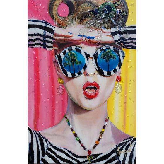 Mixed Media Giclee piece comprised of Acrylic, foil, glass and resin on board-mounted canvas. Please note each piece will vary slightly in color and styling.
