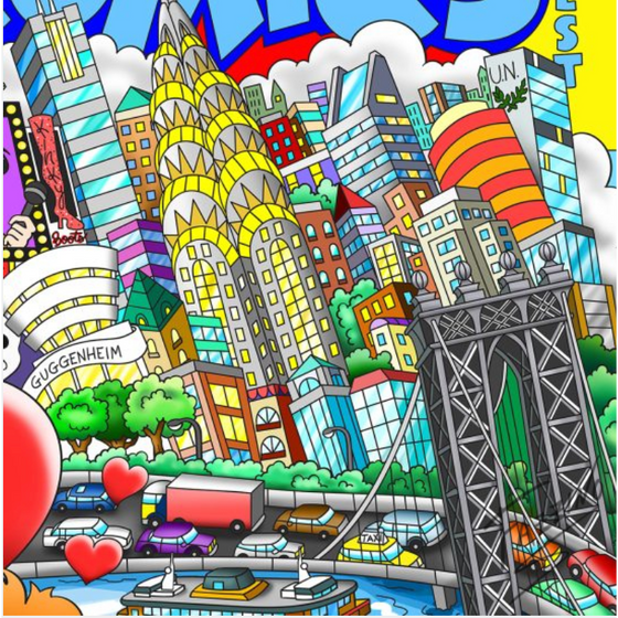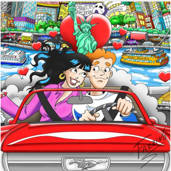 Beloved comic characters Archie and Veronica cruise through New York City in this Charles and Heather Fazzino collaborative Limited Editon “Archie Comics”.
