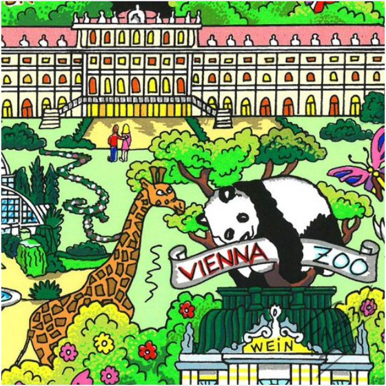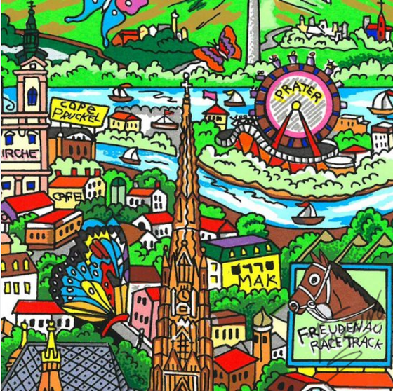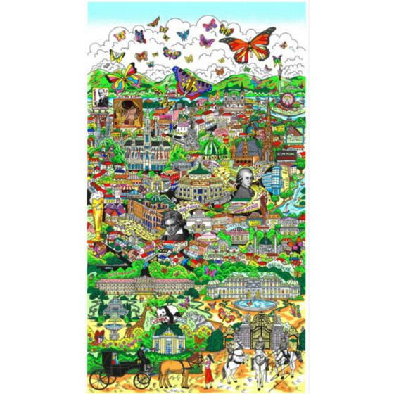 Created during Fazzino’s Butterfly Phase, “Butterflies Over Vienna” features a dazzling set of colorful wings flying over the capital of Austria. Celebrating the cities historical contributions to science and culture, Fazzino pays tribute to a myriad of icons including Mozart, Gustav Klimt, Freud, and Beethoven.