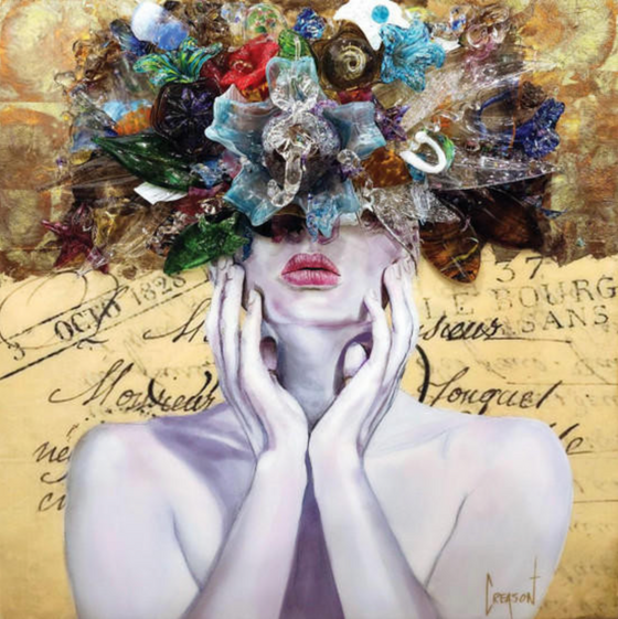 Mixed Media Giclee piece comprised of Acrylic, foil, glass and resin on board-mounted canvas. Please note each piece will vary slightly in color and styling.