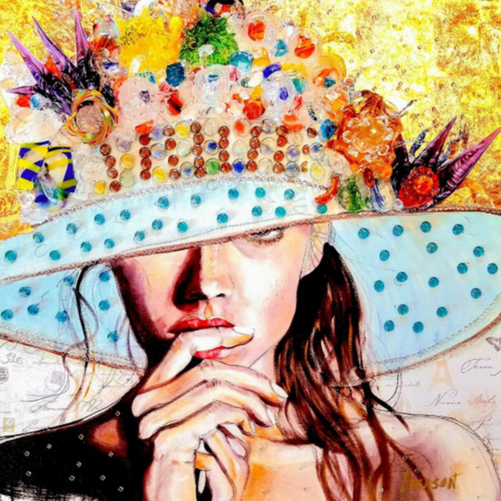 Mixed Media Giclee piece comprised of Acrylic, foil, glass and resin on board-mounted canvas. Please note each piece will vary slightly in color and styling.