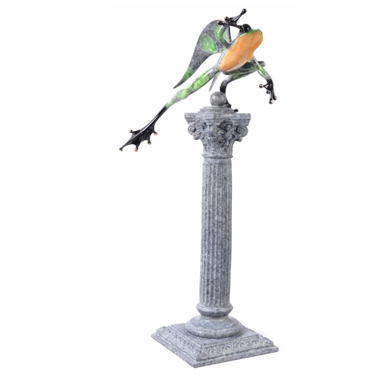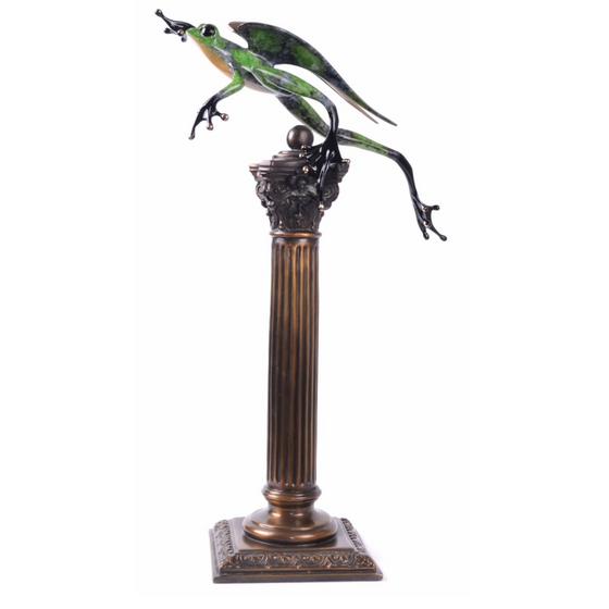 A mythical, winged frog, bearing the classic Frogman “old-school” patina, balances atop the capital of an archetypal Corinthian column, preparing for flight. To emphasize the significance of wings as a motif in mythology, the upper surface of the wings are highly polished to a rich, golden finish.