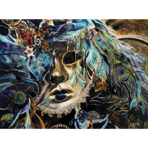 Mixed Media Giclee piece comprised of Acrylic, foil, glass and resin on board-mounted canvas. Please note each piece will vary slightly in color and styling.