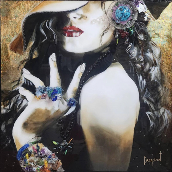 Mixed Media Giclee piece comprised of Acrylic, foil, glass and resin on board-mounted canvas.